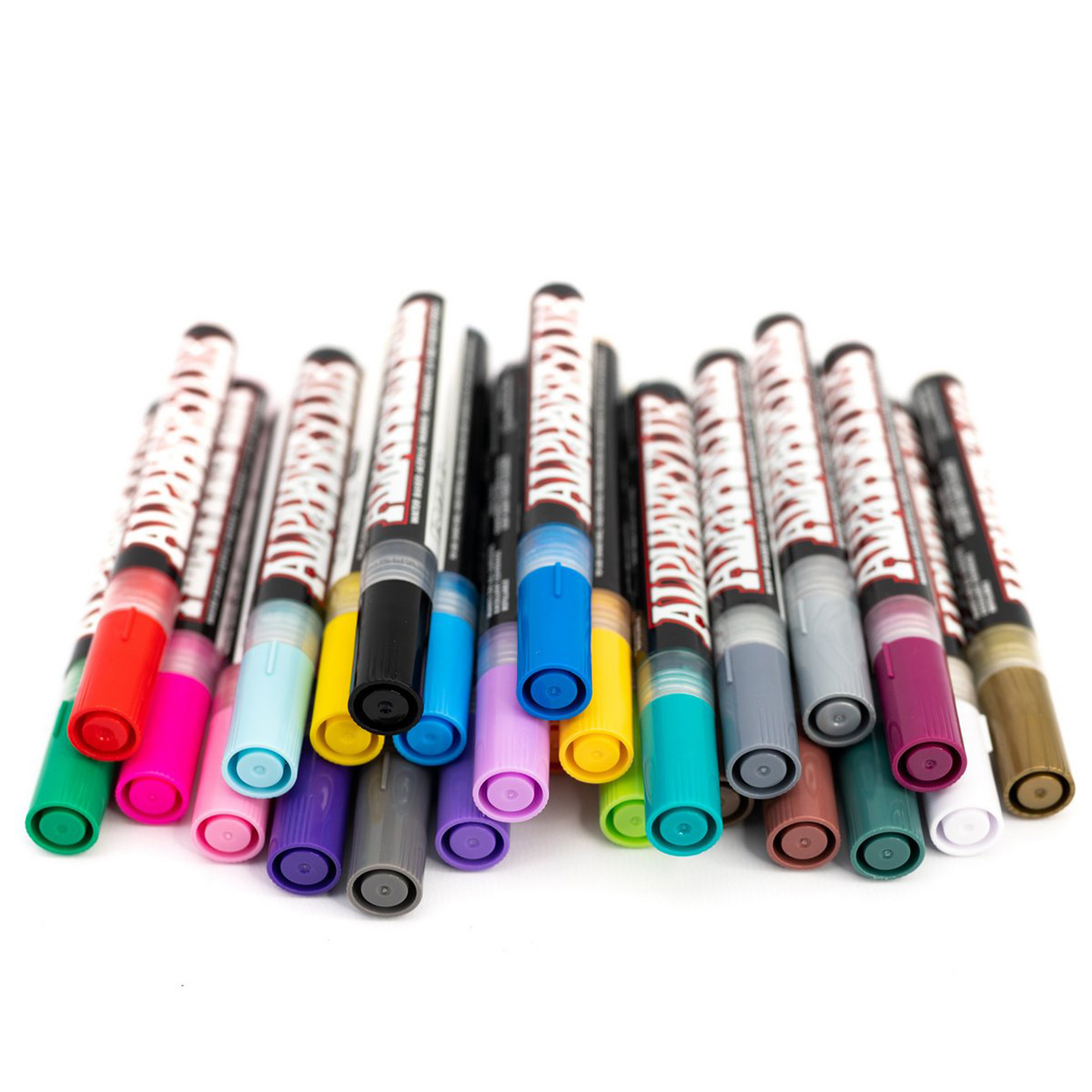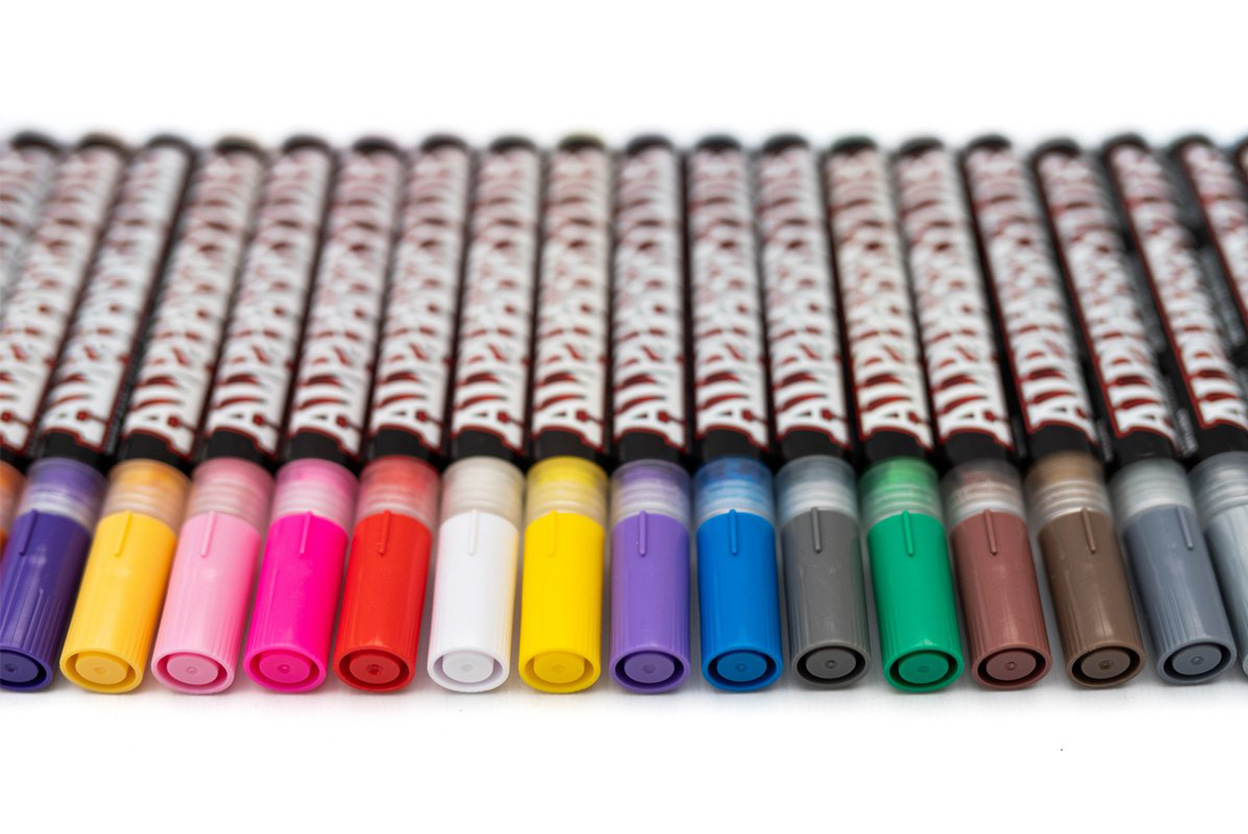 Alphakrylik water-based paint markers. Weatherproof, permanent, indoor/outdoor durability.