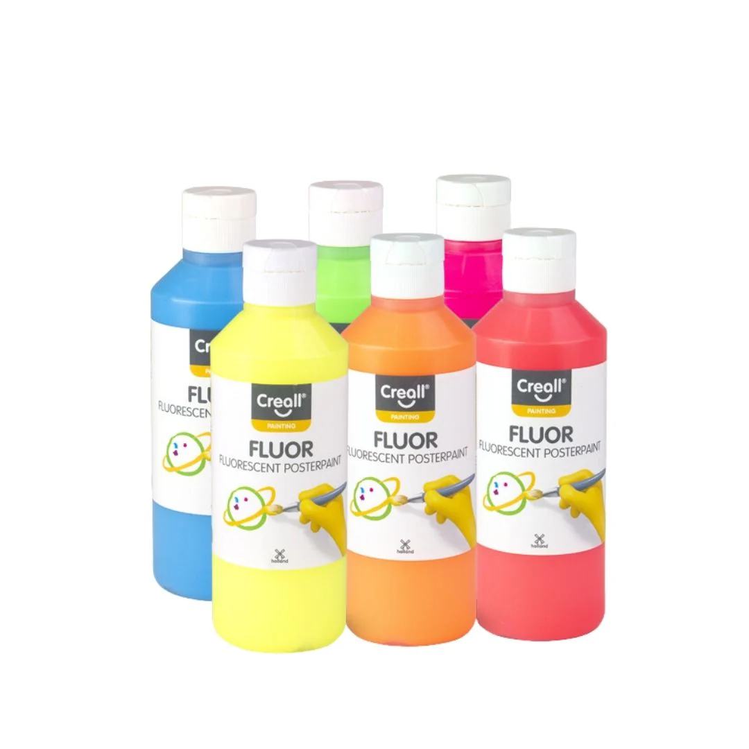 Creall Fluor is a fluorescent, water-based poster paint with an extra dose of pigment for brightly illuminating colours.