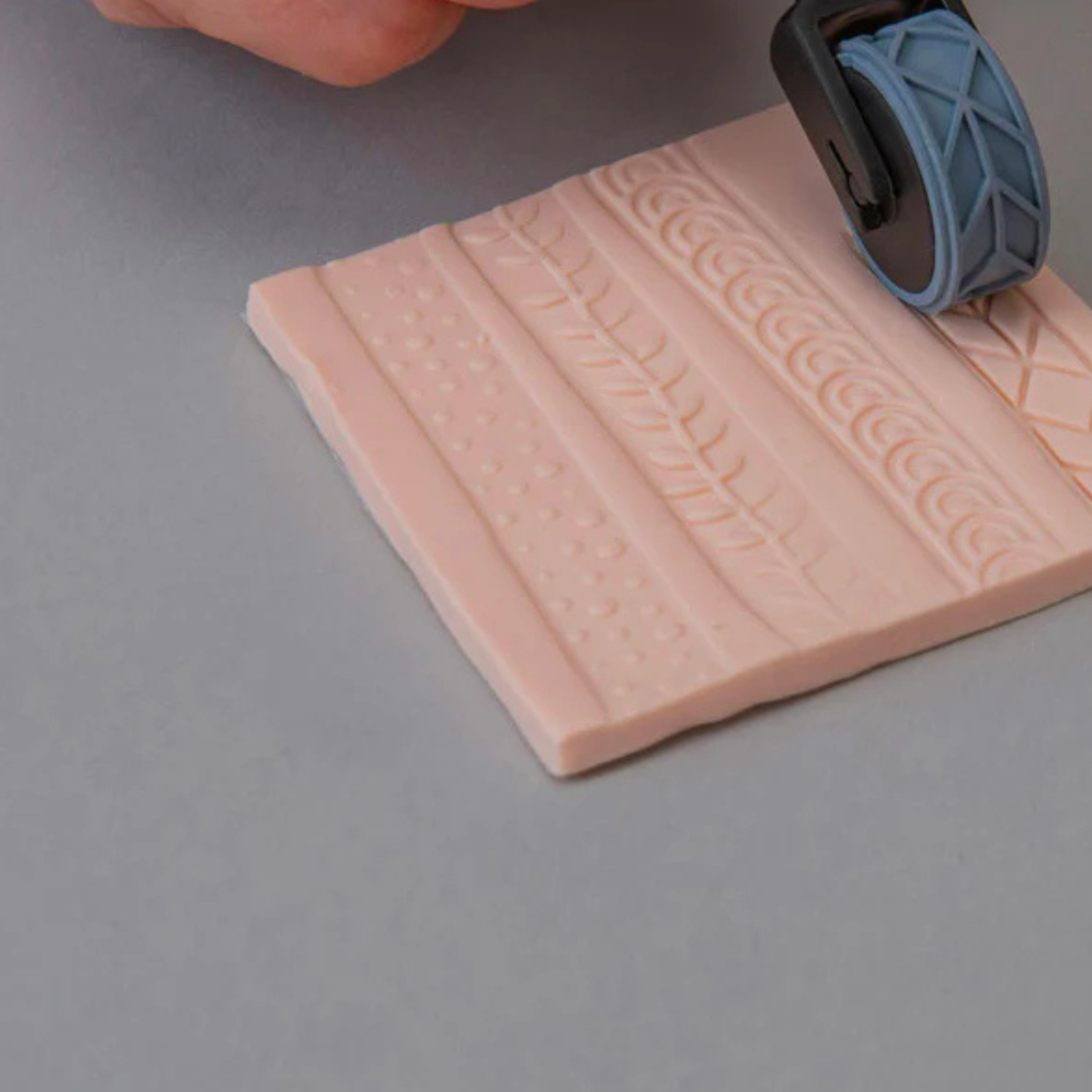 Just apply pressure to the handle while rolling the wheels against a piece of clay to make these elegant design imprints. The amount of pressure you use gives you different amounts of design definition. If you prefer sharper, heavier features, roll the wheel with enough force to displace the clay. For more delicate imprints and just a hint of texture, gently roll the wheel over the surface of your piece.