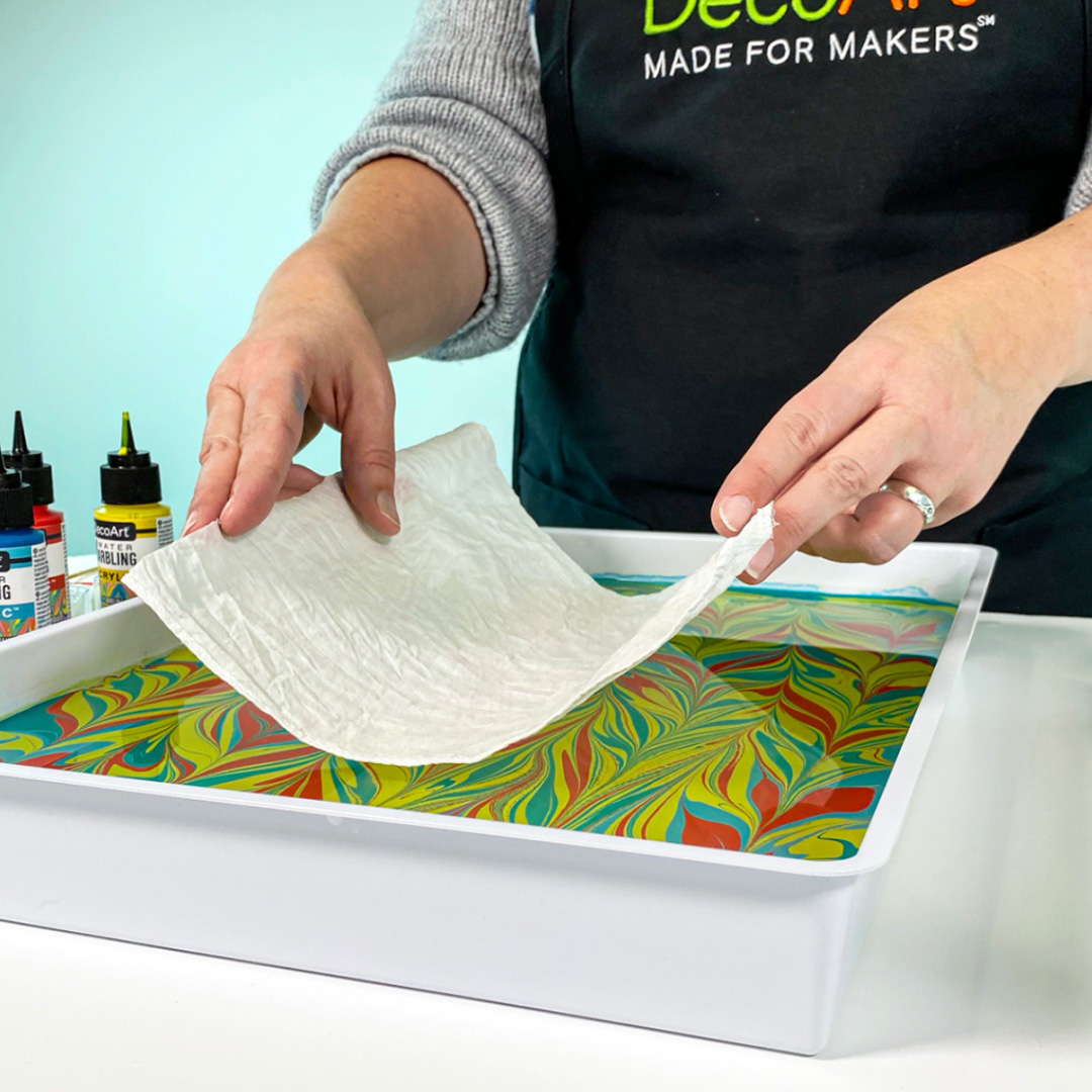 - In a container that allows fabric to be fully submerged and float freely (do not crowd), combine hot water and Marbling Surface Prep at a ratio of 1.5 tsp of surface prep to to 4 cups of water (2 Tbsp/gallon).