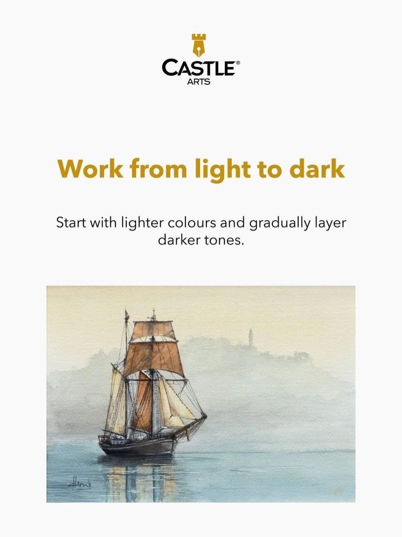One of the most important rules in watercolour is to start with lighter colours and gradually build up to darker tones. Unlike opaque paints, watercolours are transparent, so dark pigments can easily overpower lighter ones. By layering gradually, you maintain depth and luminosity in your work. Think of it as building a story: the lighter base sets the scene, and darker tones bring in the drama.