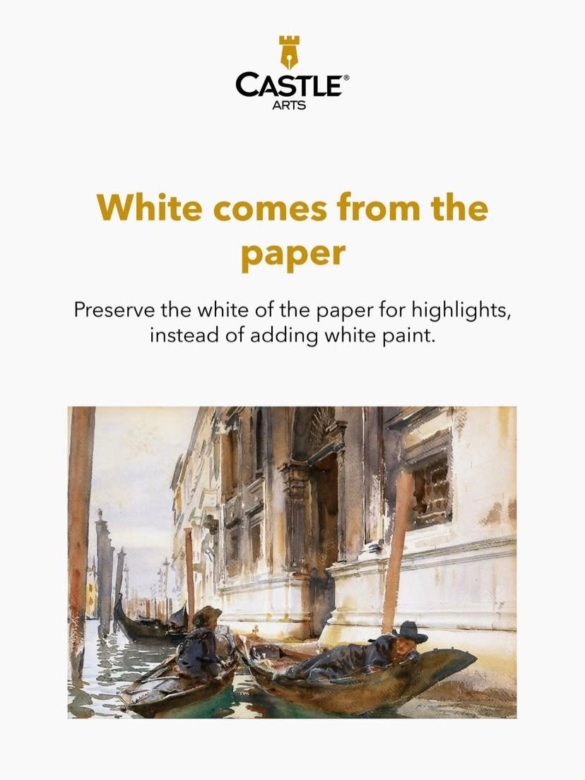 Unlike acrylic or gouache, watercolour doesn’t need white paint. The white areas in your painting come from the paper itself. Preserve the untouched paper for highlights and reflective surfaces. This simple rule can make a huge difference, giving your work that signature glow that only watercolour can achieve.